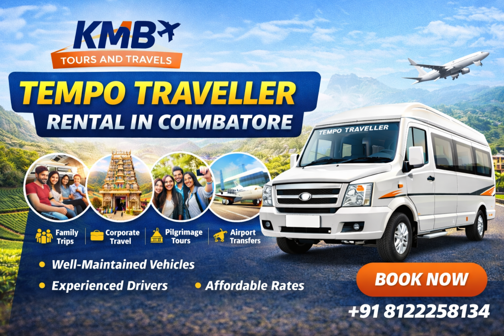 If you are looking for a dependable Tempo Traveller Rental in Coimbatore, KMB Tours and Travels is your trusted travel partner. We specialize in providing spacious, comfortable, and well-maintained Tempo Travellers for all types of group travel needs. Whether it’s a family vacation, corporate outing, pilgrimage tour, or airport transfer, we ensure a smooth and stress-free journey from start to finish.